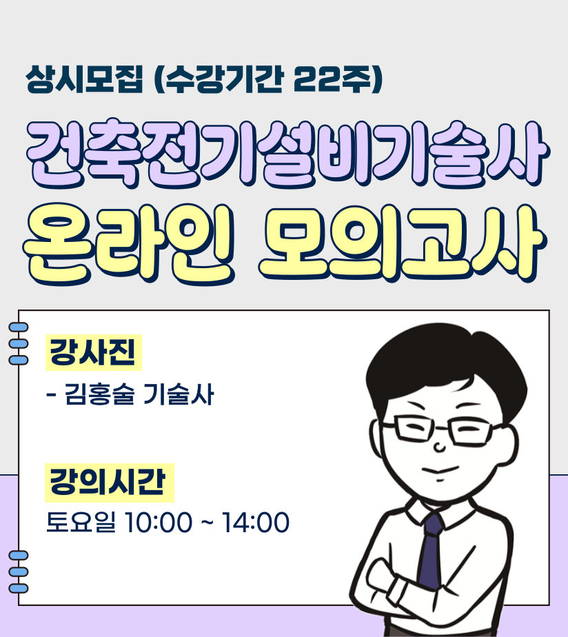 최신 개강 과정 상시모집 건축전기설비기술사 필기온라인 모의고사반 과정보기 4월 4일 개강 2026년 제1기 건축전기설비기술사 [정규반] 과정보기 3월 30일 개강 전기(산업)기사 필기정규반 전기기기 – 기술기준 강좌 진행 3월 30일 개강 전기(산업)기사 필기 문제풀이반 강좌 진행 4월 6일 개강 전기(산업)기사 필기 단기종합반 강좌 진행 온라인 강의 전기기능사 전기기사 기출문제집 전기(산업)기사 필기 전기(산업)기사 실기 건축전기설비기술사 무료강의 전기기능사 실기 이론 (무료강의) 과정보기 20,000 2026 전기기사 필기 핵심 기출문제 7개년 – 해설 강의 – 전기자기학 (교재 미포함 상품) 과정보기 20,000 2026 전기기사 필기 핵심 기출문제 7개년 – 해설 강의 – 전력공학 (교재 미포함 상품) 과정보기 20,000 2026 전기기사 필기 핵심 기출문제 7개년 – 해설 강의 – 전기기기 (교재 미포함 상품) 과정보기 109,000 2026 전기기사 필기 단기종합반 현강 – 전기자기학 과정보기 109,000 2026 전기기사 필기 단기종합반 현강 – 전력공학 과정보기 109,000 2026 전기기사 필기 단기종합반 현강 – 회로이론 과정보기 280,000 2025년도 전기(산업)기사 실기 – 수변전, 단답 (교재 포함 상품) 과정보기 500,000 건축전기설비기술사 정규반 현장강의 (기본이론 + 전원설비) 과정보기