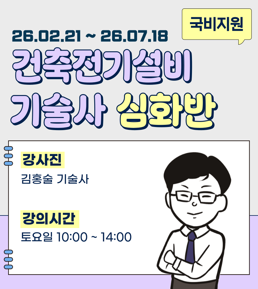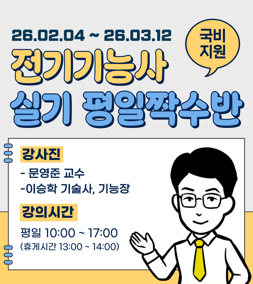 최신 개강 과정 1월 27일 개강 전기(산업)기사 필기정규반 회로이론-제어공학(야간반) 강좌 진행 1월 31일 개강 전기기능사 [실기] 주말반 강좌 진행 2월 2일 개강 전기기능사 [실기] 평일야간반 강좌 진행 2월 3일 개강 전기기능사 [실기] 평일 홀수일반 강좌 진행 2월 4일 개강 전기기능사 [실기] 평일 짝수일반 강좌 진행 2월 21일 개강 2026년 제1기 건축전기설비기술사 [정규반] 강좌 진행 2월 21일 개강 2026년 제1기 건축전기설비기술사 [심화반] 강좌 진행 2월 28일 개강 2026년 제1기 발송배전기술사 [정규반] 강좌 진행 3월 10일 개강 전기(산업)기사 실기 야간반 강좌 진행 3월 11일 개강 전기(산업)기사 실기 오후반 강좌 진행 3월 4일 개강 전기(산업)기사 필기 핵심 문제풀이반 강좌 진행 온라인 강의 20,000 2026 전기기사 필기 핵심 기출문제 7개년 – 해설 강의 – 전력공학 (교재 미포함 상품) 과정보기 20,000 2026 전기기사 필기 핵심 기출문제 7개년 – 해설 강의 – 전기기기 (교재 미포함 상품) 과정보기 280,000 2025년도 전기(산업)기사 실기 – 수변전, 단답 (교재 포함 상품) 과정보기 무료강의 전기기능사 실기 이론 (무료강의) 과정보기